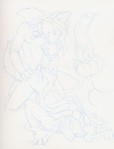 Now I get down to my .005 pen, in order to do the final detail work. This includes facial work, fur texture, muscle definition, and so on and so forth--basically, anything that was inside a previous outline. |